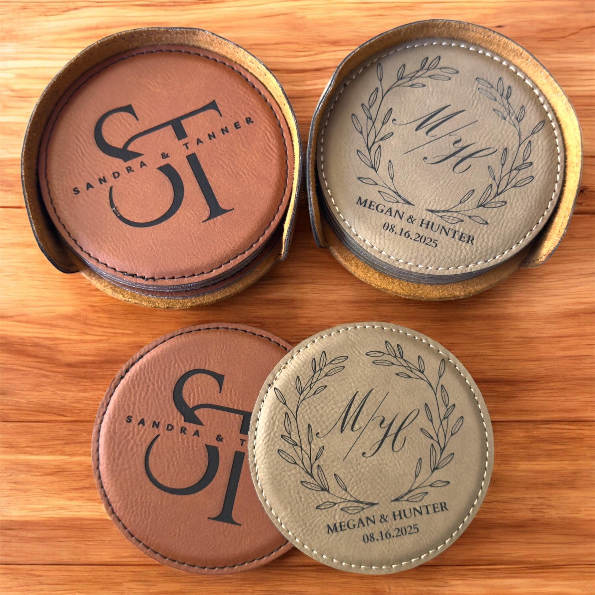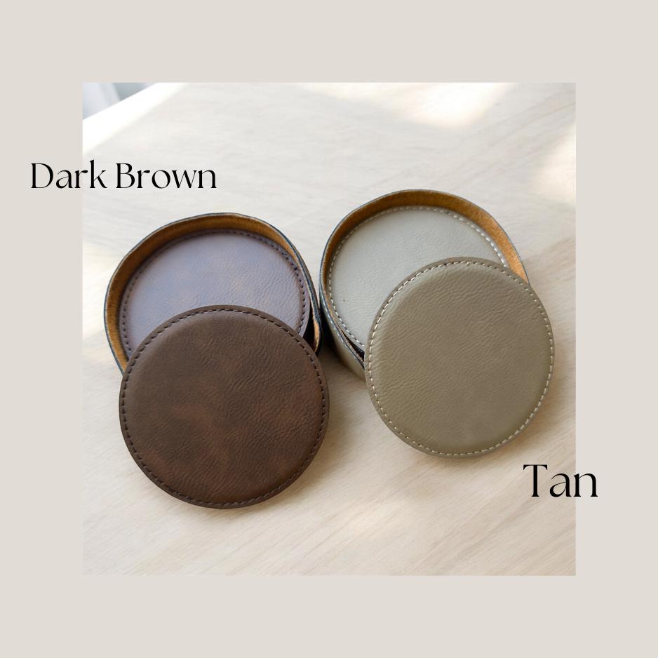 ✦ Approx. 4” This exquisite set includes 6 round leatherette coasters, beautifully engraved and accompanied by a stylish coaster holder.